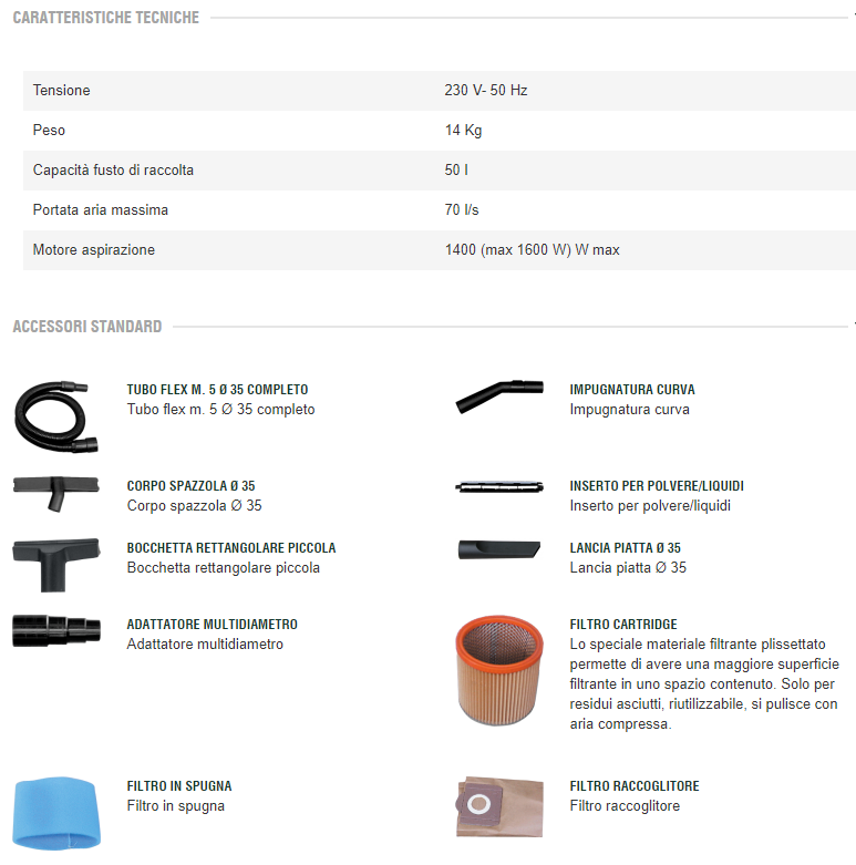 • Motore silenziato • Doppio isolamento elettrico • Sistema aspirante con raffreddamento by-pass • Vano portaccessori • Fusto in acciaio inox • Porta cavo elettrico • 4 ruote pivottanti • Presa per elettroutensili (max 2200 W) con scheda elettronica per l’arresto dell’aspiratore • Tubi di prolunga in acciaio • Ganci professionali in metallo