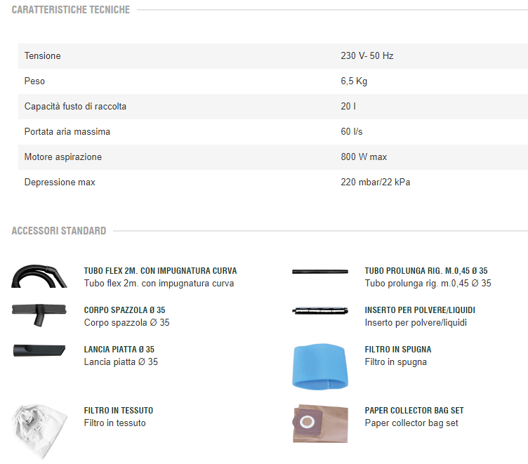 • Motore silenziato • Doppio isolamento elettrico • Sistema aspirante con raffreddamento by-pass • Vano portaccessori posteriore • Fusto in plastica • Porta cavo elettrico • 4 ruote di cui 2 pivottanti