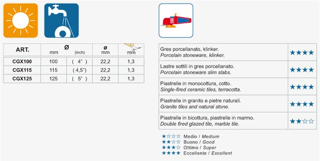 Il disco diamantato CGX115 “Freccia Oro” rappresenta l’estrema evoluzione di un disco per il taglio di Gres Porcellanato a secco. Progettato con tecnologia DNA sulla base della consolidata esperienza Montolit nel campo ceramico, riunisce i fattori che ne fanno il disco diamantato Top a livello mondiale per performances in velocità, finitura e durata.