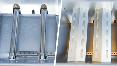 • Gli speciali bruciatori in acciaio inox creano delle particolari fi amme a “V” che contribuiscono a distribuire in maniera ottimale il calore sulla superfi cie di cottura.