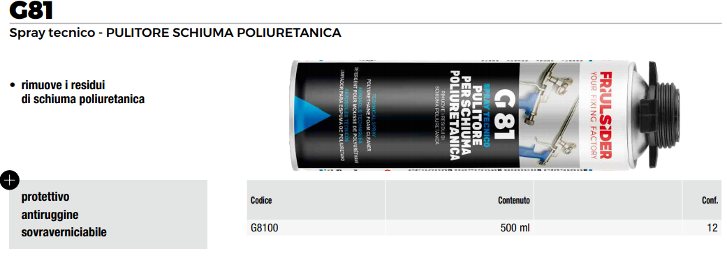 Il G81 Friulsider è un pulitore professionale spray specifico per rimuovere istantaneamente i residui di schiuma poliuretanica non indurita.