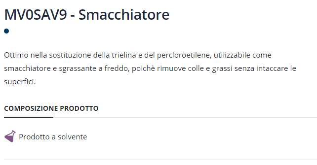 Ottimo nella sostituzione della trielina e del percloroetilene, utilizzabile come smacchiatore e sgrassante a freddo, poichè rimuove colle e grassi senza intaccare le superfici.