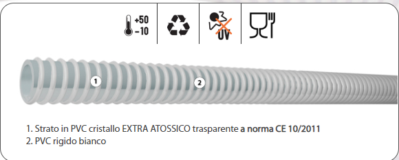 Tubo SPIRALATO per aspirazione e mandata in bassa pressione di liquidi alimentari secondo la Direttiva Europea Reg. CE 10/2011 per i Simulanti A-B-C Il tubo Spiralato è utilizzato nei settori dell’edilizia, industria, agricoltura ed agroalimentare. Maneggevole, flessibile, resistente agli agenti atmosferici ed agli agenti chimici moderatamente aggressivi. Ottima resistenza all’invecchiamento.